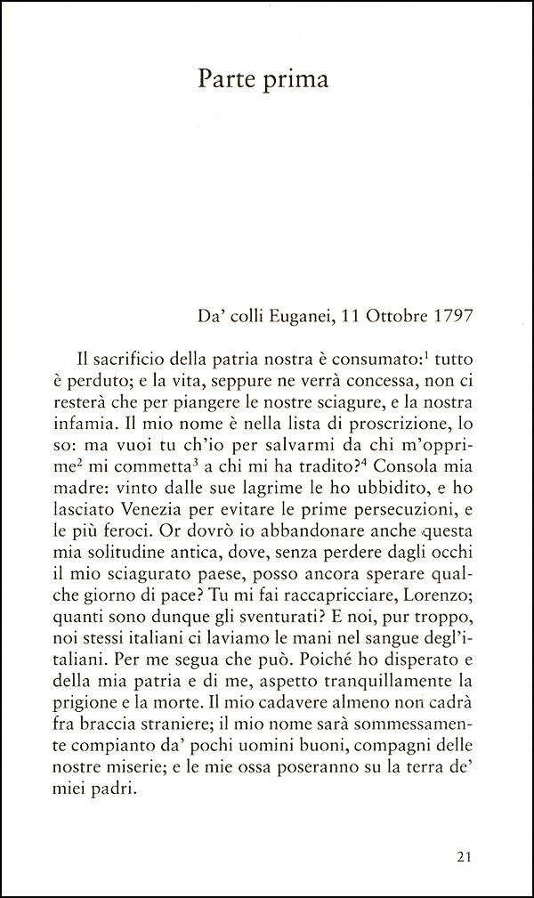 Ultime lettere di Jacopo Ortis/Parte prima - Wikisource ULTIME LETTERE D'JACOPO ORTIS Libertà va cercando ch'è sì cara, Come sa chi per lei vita rifiuta. Dante. Da' colli Euganei, 11 ottobre 1797. Il sacrificio della patria nostra è consumato: tutto è perduto; e la vita, seppure ne verrà concessa, non ci resterà che per piangere le nostre sciagure e la nostra infamia.
