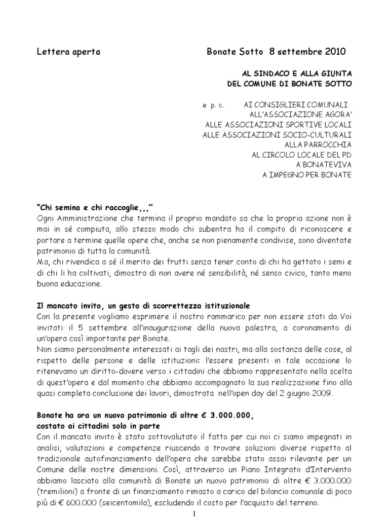 Lettera Al Sindaco e Associazioni Inaugurazione Palestra | PDF - Scribd Il mancato invito, un gesto di scorrettezza istituzionale Con la presente vogliamo esprimere il nostro rammarico per non essere stati da Voi invitati il 5 settembre all'inaugurazione della nuova palestra, a coronamento di un'opera così importante per Bonate. Non siamo personalmente interessati ai tagli dei nastri, ma alla sostanza delle cose, al